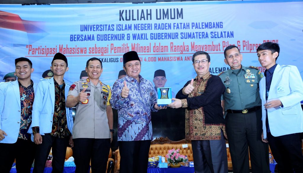 PALEMBANG | Koranrakyat.co.id — Untuk pertama kalinya sejak dilantik sebagai Gubernur Sumsel, H. Herman Deru menghadiri kuliah umum di Universitas Islam Negeri (UIN) Raden Fatah Palembang, di Gedung Akademik Center UIN RF, Kamis (18/10). Tak pelak kehadiran gubernur kebanggaan wong Sumsel tersebut langsung disambut dengan antusias ribuan mahasiswa yang hadir.