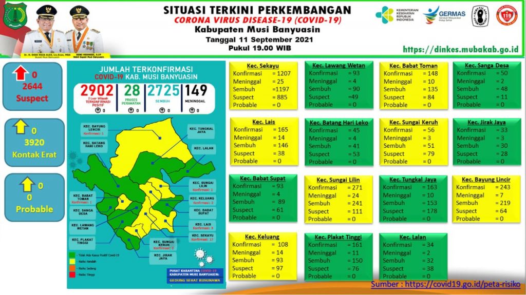 “Tidak ada penambahan kasus per 11 September 2021,” ungkap Jubir Gugus Tugas Penanganan COVID-19 Muba, Herryandi Sinulingga AP.