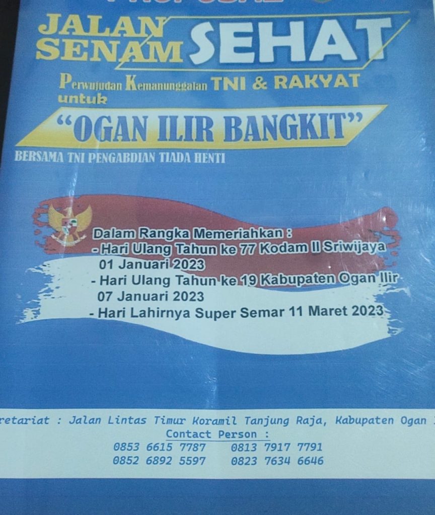 Kegiatan jalan dan senam sehat ini, diselenggarakan dalam rangka memperingati HUT ke 77 Kodam II/Sriwijaya, HUT ke 19 Kabupaten Ogan Ilir, serta memperingati Supersemar 11 Maret 2023. Dipercaya sebagai Ketua Umum adalah Kapten Iren, Danramil Tanjung Raja, ujar Kartedi.