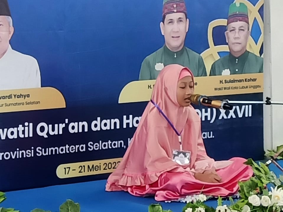 LUBUKLINGGAU | KoranRakyat co.id – TEPUK tangan secara spontan dari sejumlah pengunjung lomba cabang Tahfiz Al-Qur’an 30 juz STQH XXVII Provinsi Sumsel di Masjid Al-Baari’ Lubuklinggau, takjub atas penampilan Hanny Virginia Anggraini (10 tahun).
