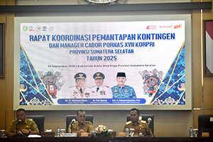 PALEMBANG | Koranrakyat..co.id —– Provinsi Sumatera Selatan (Sumsel) terus mematangkan persiapan sebagai tuan rumah Pekan Olahraga Nasional (Pornas) XVII Korps  Pegawai Republik Indonesia (Korpri) Tahun 2025. Gubernur Sumsel melalui Sekda Drs. H. Edward Candra MH mengatakan target Pepmrov Sumsel, selain prestasi juga sukses menyelenggarakan even bergengsi ini.