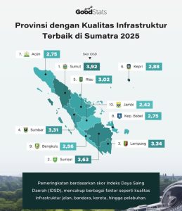 Provinsi Sumsel masuk peringkat ke-7 sebagai Provinsi dengan Kualitas Pembangunan Infrastruktur Terbaik 2025 dengan nilai 3,63%. Dalam informasi grafis tersebut tampak bahwa hanya Provinsi Sumsel dan Provinsi Sumut yang berhasil masuk 10 besar provinsi terbaik kualitas pembangunan infrastrukturnya. Catatan ini menunjukkan bahwa kualitas pembangunan infrastruktur di Provinsi Sumsel menjadi terbaik ke-2 di wilayah Sumatera.