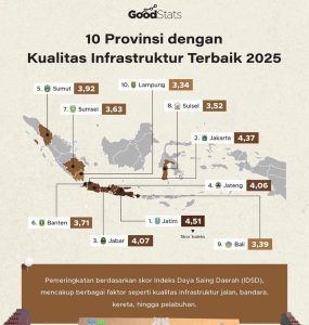 Pemeringkatan yang dilakukan GoodStats ini berdasarkan skor indeks daya saing daerah (IDSD), mencakup berbagai faktor seperti kualitas infrastruktur jalan, bandara, kereta, hingga pelabuhan.