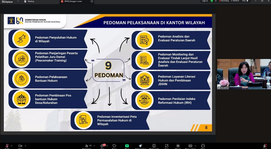Rakernis juga diisi dengan pemaparan teknis terkait pendampingan penilaian Indeks Reformasi Hukum (IRH) Pemerintah Daerah, pedoman analisis dan evaluasi peraturan daerah dengan target minimal 10 perda pada tahun 2026, penguatan literasi hukum berbasis digital, pembinaan Jaringan Dokumentasi dan Informasi Hukum (JDIH), serta pelaksanaan bantuan hukum dan penyuluhan hukum di daerah, termasuk penjaringan peserta pelatihan Juru Damai.